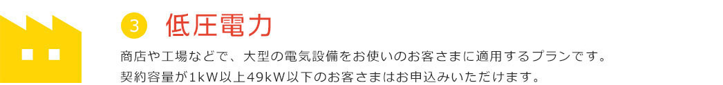 商店や工場などで、大型の電気設備をお使いのお客さまに適用するプランです。 契約容量が1kW以上49kW以下のお客さまはお申込みいただけます。